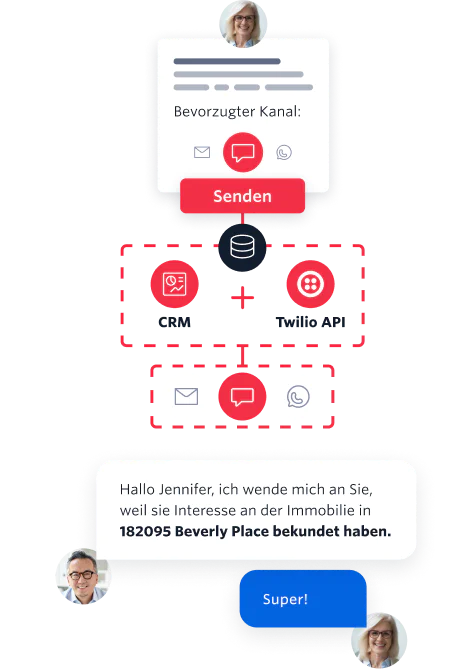 Wenn ein Lead eintrifft, ist es wichtig, schnell zu reagieren. Mit Twilio können Sie über SMS, E-Mail, WhatsApp oder Voice Lead-Benachrichtigungen ganz einfach in Echtzeit erstellen. So verpassen Sie keine Verkaufschance mehr.